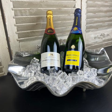 Stor nikkelbelagt skål i oval form til champagne- eller vinglas med indgraveret tekst fra Lily Bollinger og Napoleon Bonaparte på to sider.