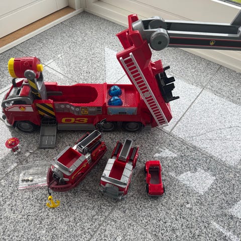 Samling biler samt Paw Patrol udklædning. 1 stk. Stor skolebus, 1 stk. Grøn lang bus, 1 stk marshal brandbil inkl. Figur samt diverse marshal branduklædning. Fra hjem uden dyr og røg. Sælges kun samlet.