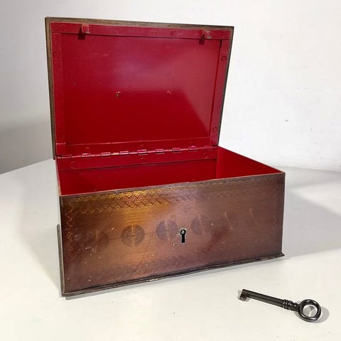 Fransk Baumont-mærkede bærbar lille pengeskab i stål, sort, industrielt design, med lås og nøgle, målene 11 x 29 x 20 cm, vægt 3,6 kg, i pænt brugt stand med mindre aldersmærker. Klik på den blå "gå til varen" knap, for at købe eller byde på denne vare. Den samlede pris vil blive vist inden du afgiver dit bud.