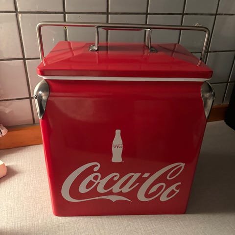 Coca-Cola officiel vintage design bærbar køler i rød metal, 30 cm bred, 24 cm dyb, 23 cm høj, vægt 2 kg, estimeret periode 2000–2010, i fantastisk stand og i gang, med integreret flaskeåbner. Klik på den blå "gå til varen" knap, for at købe eller byde på denne vare. Den samlede pris vil blive vist inden du afgiver dit bud.