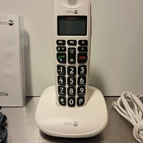 Doro PhoneEasy® 100w er en trådløs telefon med et letlæseligt display og ekstra tydelig lyd. Den er også udstyret med store taster, som gør telefonen nem at betjene. Doro arbejder aktivt på at reducere belastningen på miljøet og inkluderer derfor ikke længere det traditionelle telefonstik i emballagen. Disse kan bestilles separat under ’tilbehør’