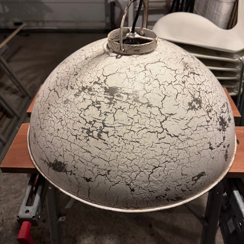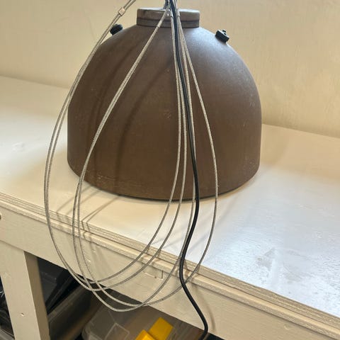 Klassisk københavnerlampe de lux. Belagt med kobber indvendigt, så lyset får en varm og hyggelig tone. Ombygget til tre E27 fatninger, som giver et fyldigt lys f.eks. over spisebordet. Fremstår i det originale robuste glasfiber, umalet i den oprindelige brune nuance.