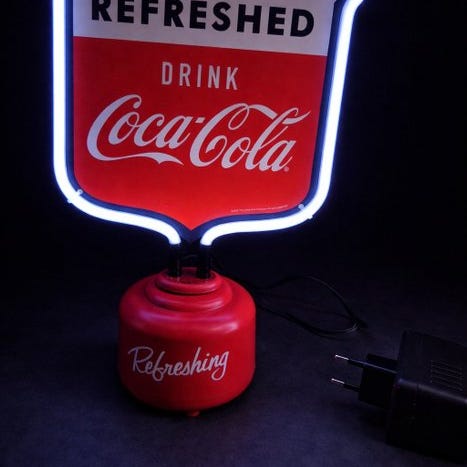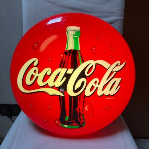 Denne skilt har den italienske tekst "Bevete! Coca-Cola", hvilket gør den til et særligt interessant stykke for det europæiske marked og for samlere af lokalt memorabilia, beriget af teksten "Registreret varemærke".