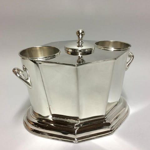 Smuk champagnekøler på høj fod, til 4 flasker med flaskeopdeler som låg - Coupe-model.