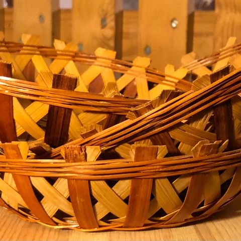 Guldfarvet flettet brødkurv med brødserviet / kikseserviet.