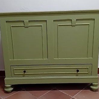 Et industrielt metal-skab i grøn farve med låge og hylder i bunden, mulighed for at blive låst med sin nøgle, og øverst et klaprum. Det blev brugt til kaffemaskinen, og i den lille skuffe blev kaffeladningen i maskinen slået ud for at tømme den. Kommer fra en fabrik i Bresciaområdet. Produktionsår mellem 1990 og 2000, højde 84 cm, bredde 35 cm, længde 35 cm. Viser tidstegn, men stadig i god stand.