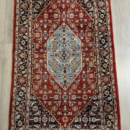 Smukt håndknyttet østligt tæppe i Bidjar-stil, kendetegnet ved et rigt udarbejdet centralt medaillon og et meget detaljeret felt med blomstrede motiver. Tæppet har en varm og harmonisk farvesammensætning med beige, røde- og blå nuancer, hvilket giver et tidløst og elegant udtryk.