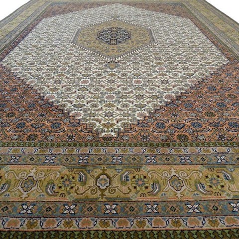 Håndvævet orientalsk tæppe fra Indien i Bidjar-stil med centralt medaillon, uld på bomuld, ca. 304 × 212 cm og vægt ca. 26,5 kg, dateret til slutningen af det 20. århundrede, generelt i god stand med let slid og nogle få pletter. Klik på den blå "gå til varen" knap, for at købe eller byde på denne vare. Den samlede pris vil blive vist inden du afgiver dit bud.