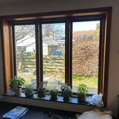 Vinduet er helt nyt, men enkelte revner er opstået ved afmontering omkring skruehuller. Det kan nemt slibes og males.