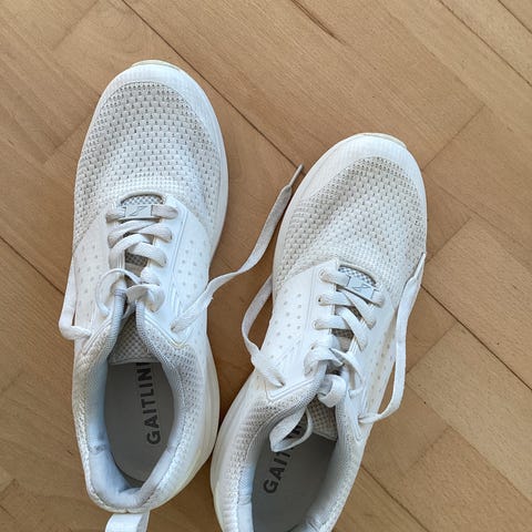Gaitline sko i størrelse 43 i sort med hvid sål. Overdel i tekstil/mesh med snørelukning. Ydersål med mønster for bedre greb. Velegnet som hverdagssko eller til let træning. Brugt et par gange. Køber betaler porto