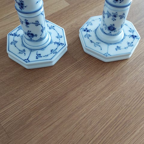 Den anden har haft et skår i foden, som er repareret (se billeder). Stagen er stadig stabil og dekorativ.