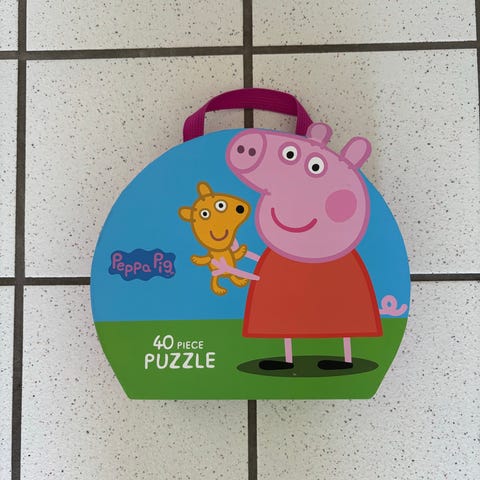 Det ene puslespil har motiv med Gurli Gris og familien udendørs og består af 50 brikker.