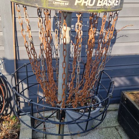 Disc golf kurv i metal til udendørs brug. Kurven har kæder til at opfange discen og en rund trådkurv nederst. Monteret på fast stolpe, egnet til opsætning i have, på mark eller på mindre disc golf bane. Velegnet til træning og fritidsspil med disc golf discs udendørs.