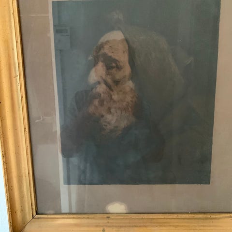 Portrætmaleri på lærred i sort og guld med motiv af et ansigt i nærbillede. Maleriet er rektangulært og opspændt på en træramme, klar til ophæng. Farverne er primært mørke nuancer med gyldne detaljer, der giver et dramatisk og abstrakt udtryk. Velegnet som vægdekoration i stue, soveværelse eller gang. 50x100