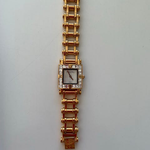 Guldfarvet ur med 12 små sten. Remmen er murstens rem og 20cm lang oh 1,5cm bred.