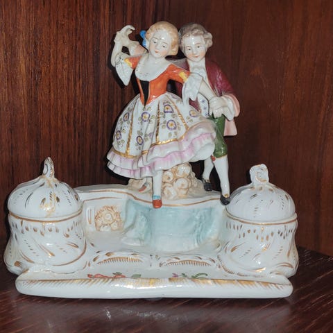 Dette er en antik blækflaske af glas, sandsynligvis fra slutningen af det 19. eller begyndelsen af det 20. århundrede, da blækflasker blev masseproduceret.