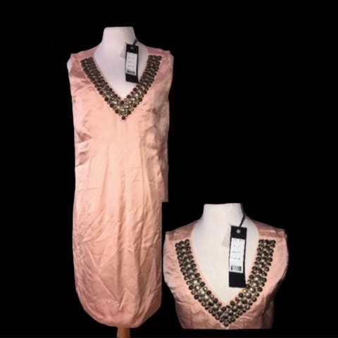 H&M smukkeste maxikjole til festlige begivenheder i str. M til dame. Kjolen er fremstillet i 100 % polyester med polyesterfoer. Designet har et plisseret udtryk og tynde stropper. Farven fremstår som mørk rosametallice/nude-tonet. Velegnet som let sommerkjole eller til brug ved festlige lejligheder i varmere vejr. Materialet er let og glat, og kjolen har indvendigt foer for øget komfort. Vask og pleje efter anvisningerne på mærket. Prismærke er taget af men den er aldrig blevet brugt.
