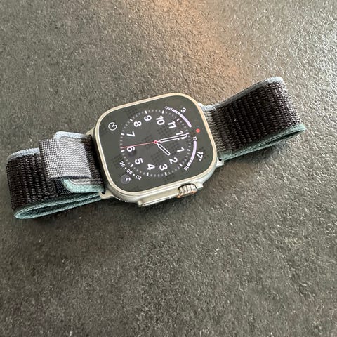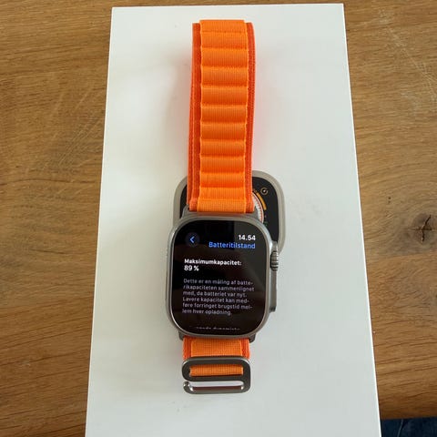 Apple Watch Ultra smartwatch med 49 mm urkasse i titanium og grå rem. Uret har rektangulær skærm med farvedisplay og digital krone i siden. Leveres i original emballage med indvendig æske og indlæg. Velegnet som aktivitets- og træningsur samt til daglig brug med smart-funktioner som notifikationer og apps, afhængigt af tilsluttet enhed og softwareversion.