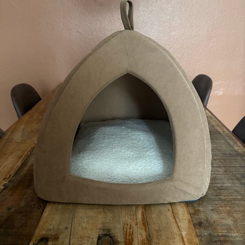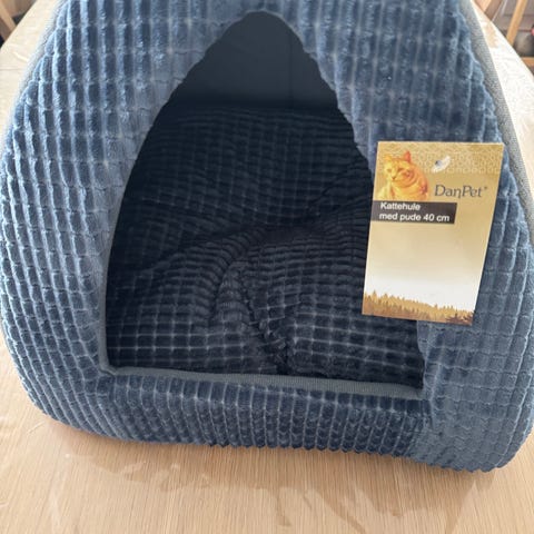 Kæledyrshule til kat eller lille hund i grå fleece. Hulen har trekantet åbning foran og blød, polstret pude indeni. Ydersiden er i blødt fleece-lignende materiale, som giver en lun og afskærmet liggeplads. Velegnet til indendørs brug som sove- og hvileplads for mindre kæledyr.