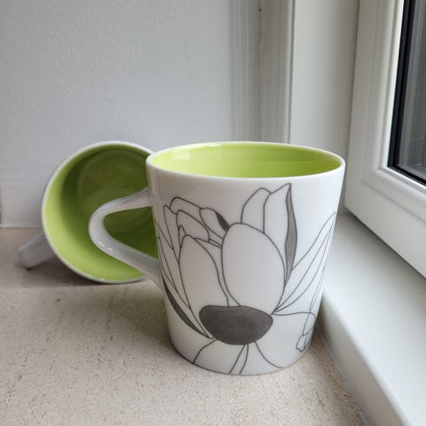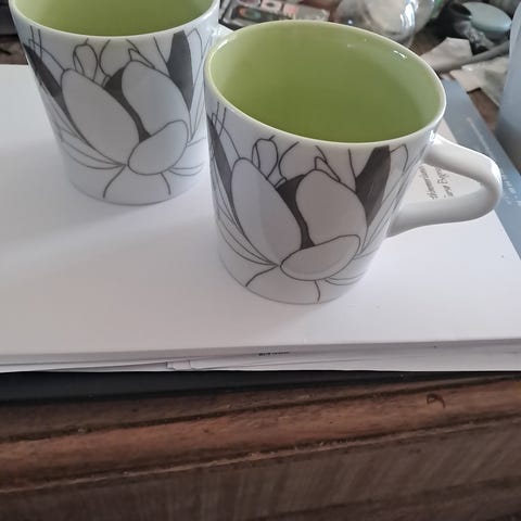 3 flotte "Pia" krus fra Rörstrand med smuk hvid og grå Magnolia mønster udvendigt og limegrøn farve indvendigt. Produceret i 1990'erne.