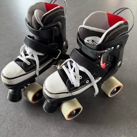 Skeight rulleskøjter til børn i størrelse 27-30. Klassiske side-by-side rulleskøjter med fire hjul og bremse foran. Farve hovedsageligt sort med lyse detaljer. Justerbare spænder og velcrostropper for fast pasform. Velegnet til børn, der vil køre rulleskøjter udendørs eller i hal.