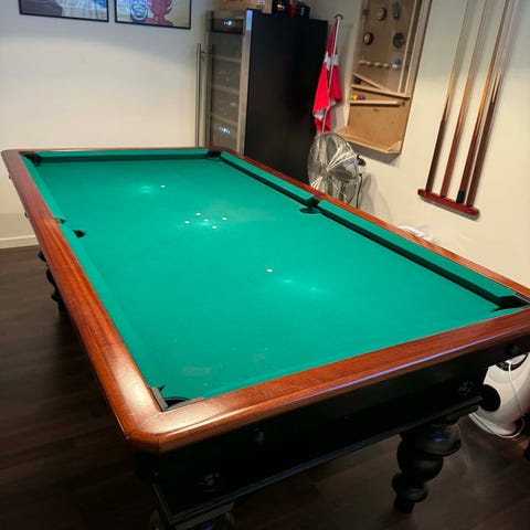 Billardbord med rektangulær spilleflade, grøn dug og stel i træ. Bordet har kraftig sokkelkonstruktion i træ og er egnet til indendørs brug, f.eks. i opholdsrum, spillelokale eller fritidsrum. Bordet har set bedre dage, men er stadig brugbart.