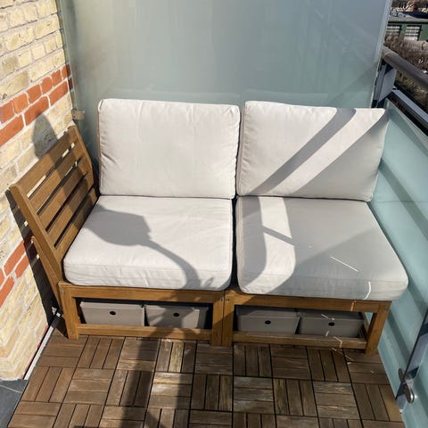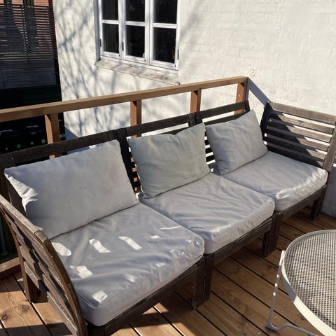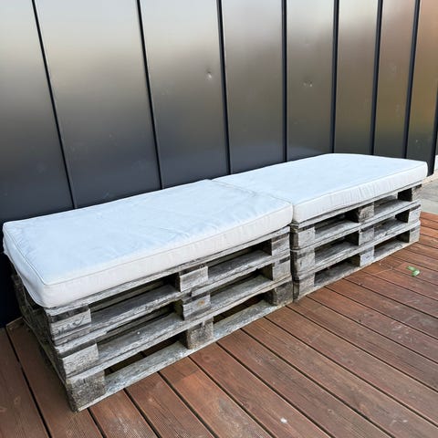 Udendørs pallebænk med ryglæn og sæde i træ. Medfølgende sædehynder og ryghynder i grå tekstil. Velegnet som loungemøbel på terrasse, altan eller i have.