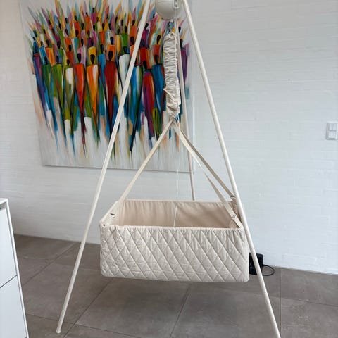 Ny moonboon vugge med stand, motor og fast rektangulær bund. Der sidder stadig mærker på, og er kun lige samlet.