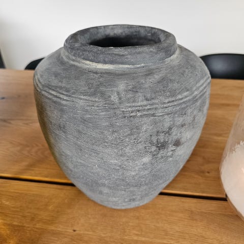 Super flot grå krukke fra Bali. Meleret udenpå med et skjult/ indridset mønster. Meget flot og dekorativ. Har kun stået til pynt og har aldrig været brugt til planter.