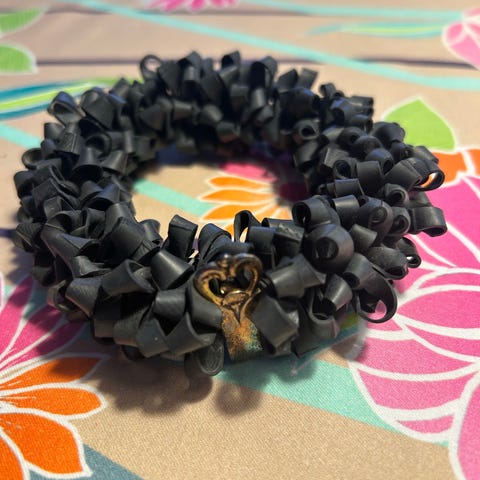Armbåndet er lavet af 8-taller af KOBBER og led af STÅL. Du kan kun se, at det er kobber, hvis du fjerner den mørke belægning, som vejr og vind har udsat den for. Leddene af stål er også mørke, fordi de er varmet op.