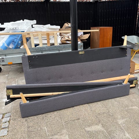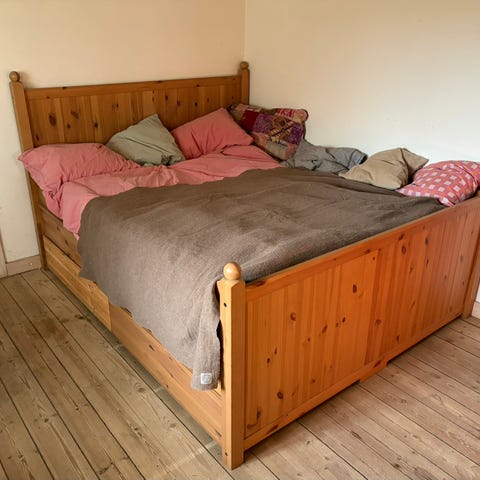 IKEA sengeramme med madras i beige tekstil. Madrassen sælges uden ben, og bunden består af faste trælameller. Der er nogle pletter, der ligner kaffe eller lignende. Sælges med Ikea-topmadras i grå. Velegnet som enkelt- eller dobbeltseng i soveværelse, gæsteværelse eller ungdomsværelse.