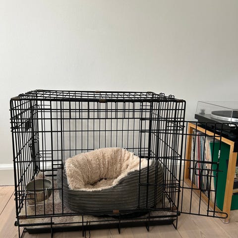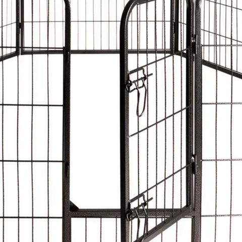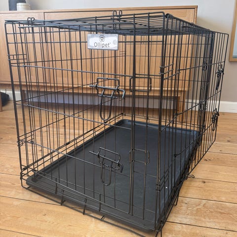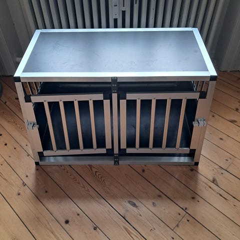 Består af fire sektioner med tremmer. Let at samle og med låge. Kan bruges både inde og ude. Brugt til vores hvalp til alene træning.