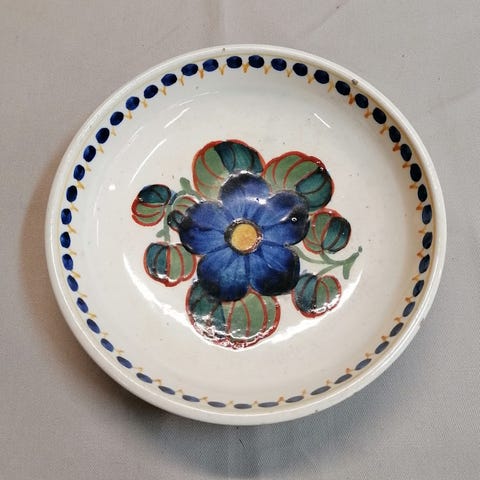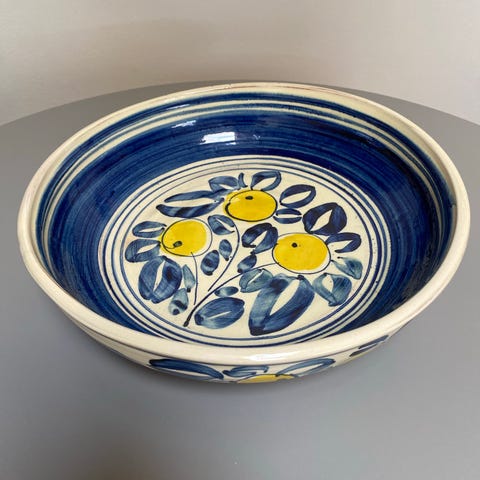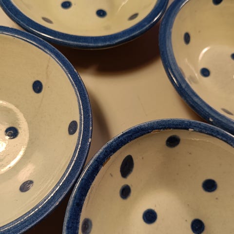 Smuk cremegul grødskål med mørkeblå kant og polkaprikker fra Hegnetslund Keramik / Hegnetslund Lervarefabrik i Herfølge.