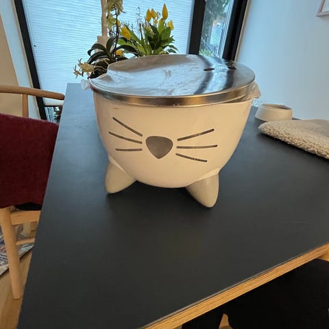Lille tallerken formet som et kattehoved i hvidt porcelæn med sort katteansigt i bunden. Tallerkenen har let forhøjede kanter og en glat underside.