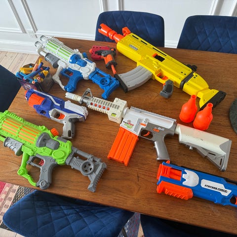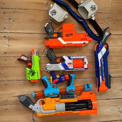 En helt masse forskellige Nerf geværer, der ikke har været brugt særligt meget. Flere af dem er med kraftige el-drevet motorer, så det kan skyde langt.