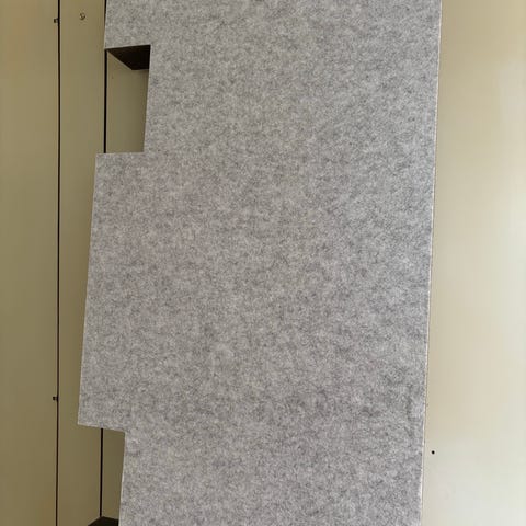 Akustik lænestol med integreret lille bord i grå polstring. Stolen har høje sider og ryg, som kan hjælpe med at afskærme for lyd og skabe et mere afgrænset arbejds- eller læseområde. Monteret på hjul, så den er let at flytte rundt i rummet. Egnet til kontor, møderum eller hjemmearbejdsplads, hvor der er behov for en kombination af siddeplads og lille arbejdsflade.