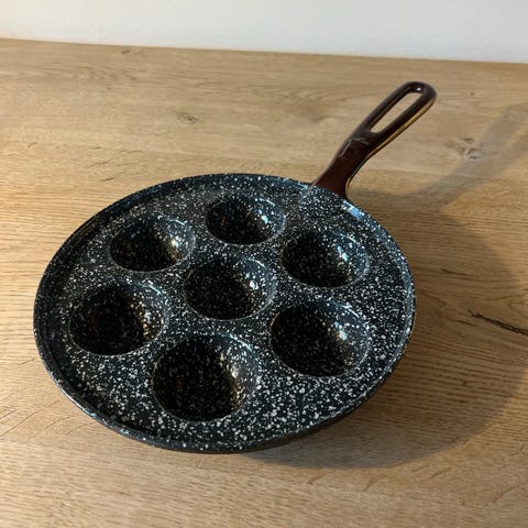 Lille gammel æbelskivepande i støbejern, til dekoration med fx fyrfadslys.