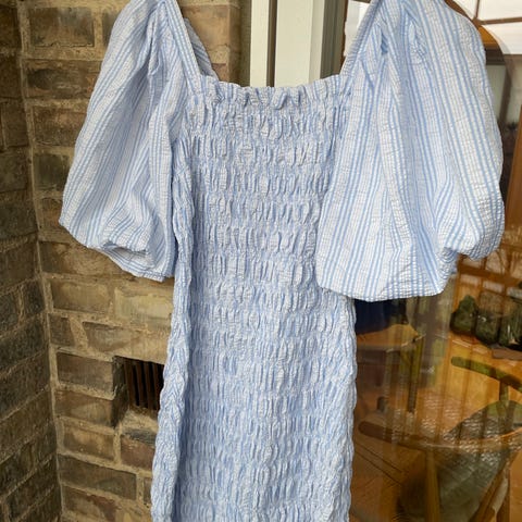 Ivy oak sommerkjole i størrelse M(38) til dame. Kjolen er blå og fremstillet i polyester. Designet har broderie anglaise-lignende hulmønster, korte puffede ærmer og flæsedetaljer forneden. Lukning i nakken med knapper samt lille ståkrave med flæsekant. Velegnet som let sommerkjole til hverdagsbrug eller mere pæne anledninger.
