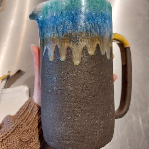 Kande med blå / grønne og sorte striber i Bangholm Keramik, sælges.