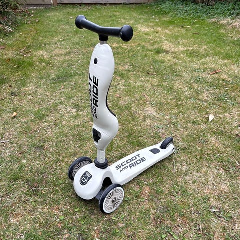Scoot and Ride løbehjul/løbecykel i blå farve med tre hjul for øget stabilitet. Styret er udstyret med håndtag i gummi. Løbehjulet leveres med matchende blå hjelm med ventilationshuller og justerbart spænde i nakken. Velegnet til mindre børn, der har brug for et stabilt løbehjul og beskyttelse til hverdagsbrug udendørs.