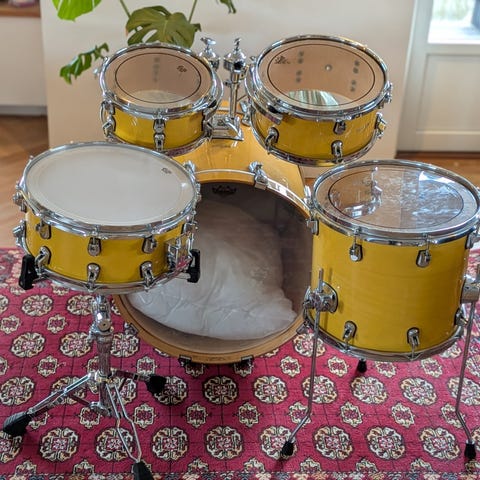 Trommesæt med kedler fra engelske Liberty Drums. 10 lag ahorn-poppel-ahorn, i stil med Gretsch og lignende topklasse trommer.