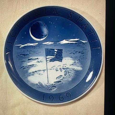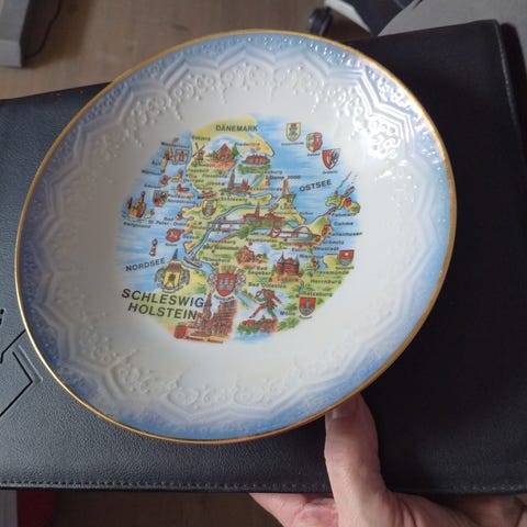 Har 4 stk tallerkener med reklame for blå Ålborg akvavit