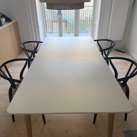 Bordet er finer, beklædt med hvidt laminat.