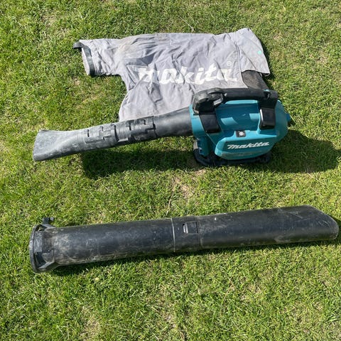 Makita løvblæser med opsamlingspose. Håndholdt model i Makitas karakteristiske blå farve med sort blæserrør. Enheden har blæse og suge funktion og er udstyret med pose til opsamling af løv og mindre haveaffald. Velegnet til oprydning på terrasse, indkørsel og andre udendørs arealer.