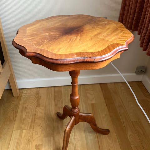 Rektangulært sofabord i træ med kraftig sokkel og to kugleformede ben. Bordpladen har indlagt, fliselignende overflade med blomsterdekoration i lyse og rødlige nuancer. Understellet er mørkt, sandsynligvis bejdset eller malet træ. Velegnet som sofabord eller sidebord i stue eller opholdsrum. Skal have en ordentlig rengøring og har også brugsspor i træet.