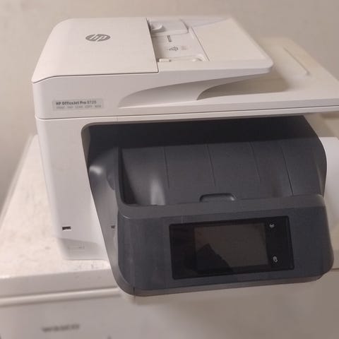 HP OfficeJet Pro 8720 multifunktionsprinter i hvid. Enheden har integreret dokumentføder øverst og frontbetjent papirbakke. Forsiden er udstyret med et betjeningspanel med farvetouchskærm. Velegnet til kontor- og hjemmebrug med funktioner som print, kopi og scan afhængigt af konfiguration og tilslutning. Designet til brug med HP-blækpatroner i OfficeJet Pro-serien.