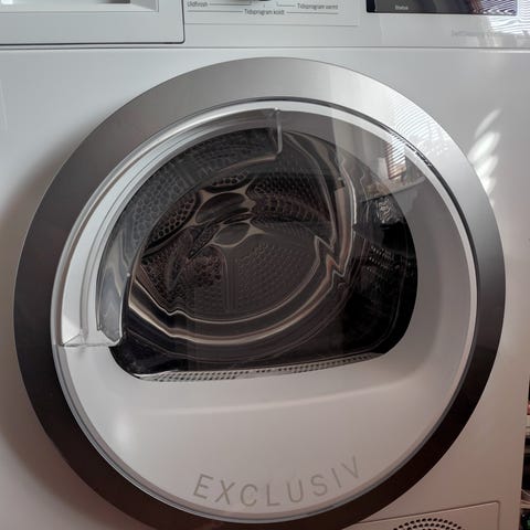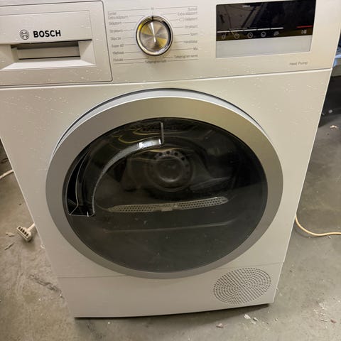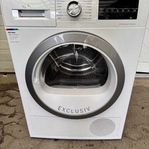 Bosch kondens tørretumbler i hvid. Frontbetjent model med rund glaslåge og elektronisk betjening via drejeknap og display.
