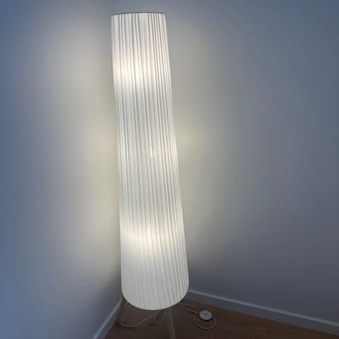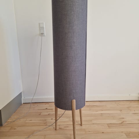 Fin gulvlampe med skærm i hør (eller lignende) materiale. Den er 110 cm høj. :)