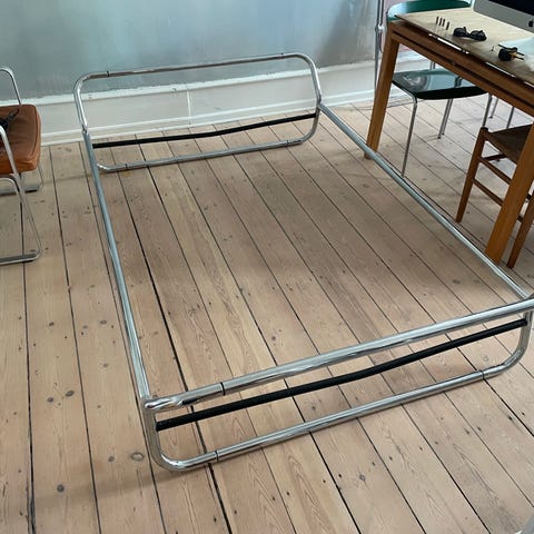 Sælger dette sengestel i krom. Der ses enkelte brugsspor men ikke afskaldninger. Det fungerer perfekt trods der mangler en enkelt skrue. Sengen