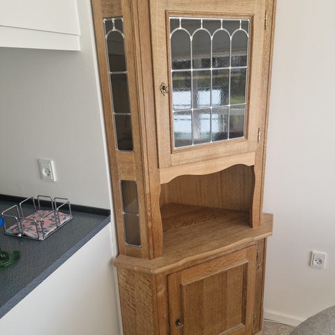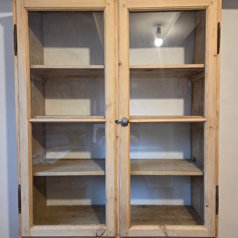 Gammelt afsyret skab med 3 hylder og glas i lågen